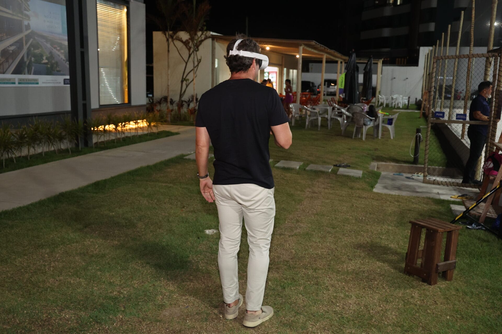 A tecnologia de realidade virtual proporcionou aos visitantes uma experiência imersiva, permitindo que passeassem pelos ambientes do Palazzo Silvia Fonseca Diniz. Com óculos VR, foi possível explorar as áreas comuns, as varandas com vista para o mar e os detalhes arquitetônicos, reforçando o compromisso da Impacto Construções com a inovação e a experiência do usuário.