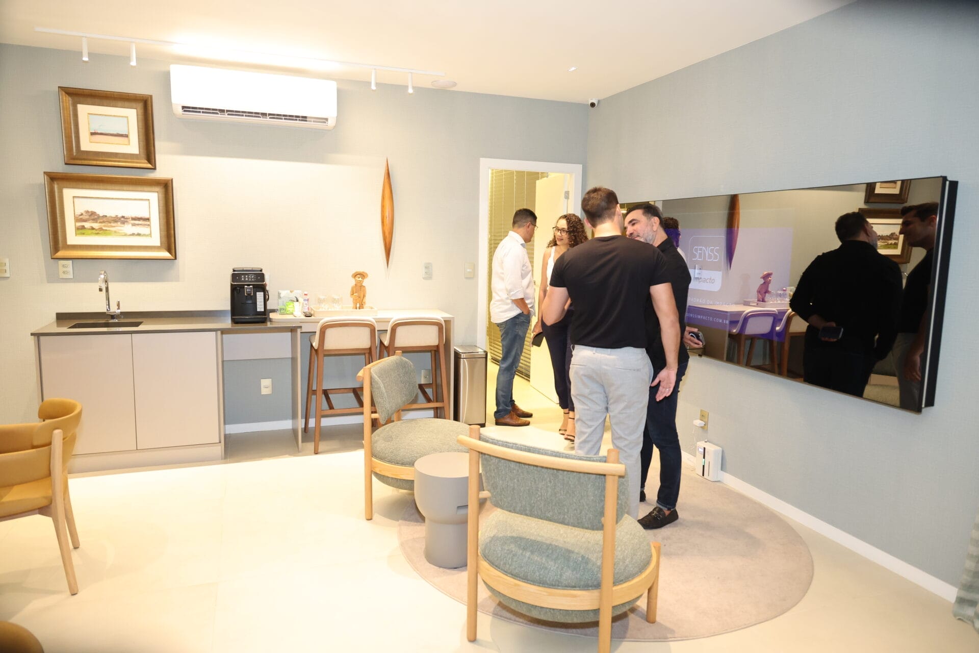 Aliás, o ambiente do evento foi cuidadosamente planejado para refletir a essência da linha SENSS, com móveis de design, iluminação acolhedora e uma experiência de realidade virtual que permitiu aos convidados explorar o empreendimento de forma interativa.